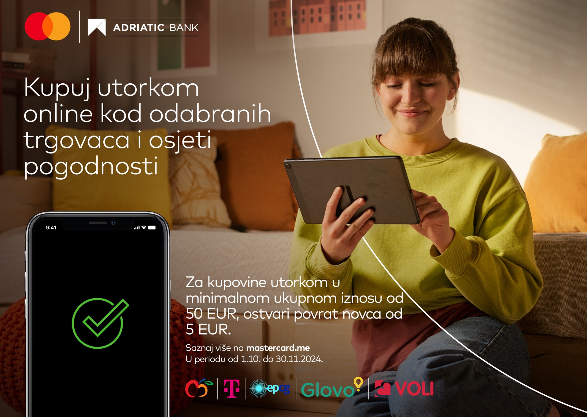 Kako bismo nagradili aktivne i podstakli druge korisnike da plaćaju onlajn, pokrećemo novu promotivnu kampanju – kupujte utorkom u periodu od 01. oktobra do 30. novembra 2024. godine svojom Mastercard karticom kod odabranih trgovaca u zbirnoj minimalnoj vrijednosti od 50 EUR, i ostvarujete pravo na povrat novca u iznosu od 5 EUR.